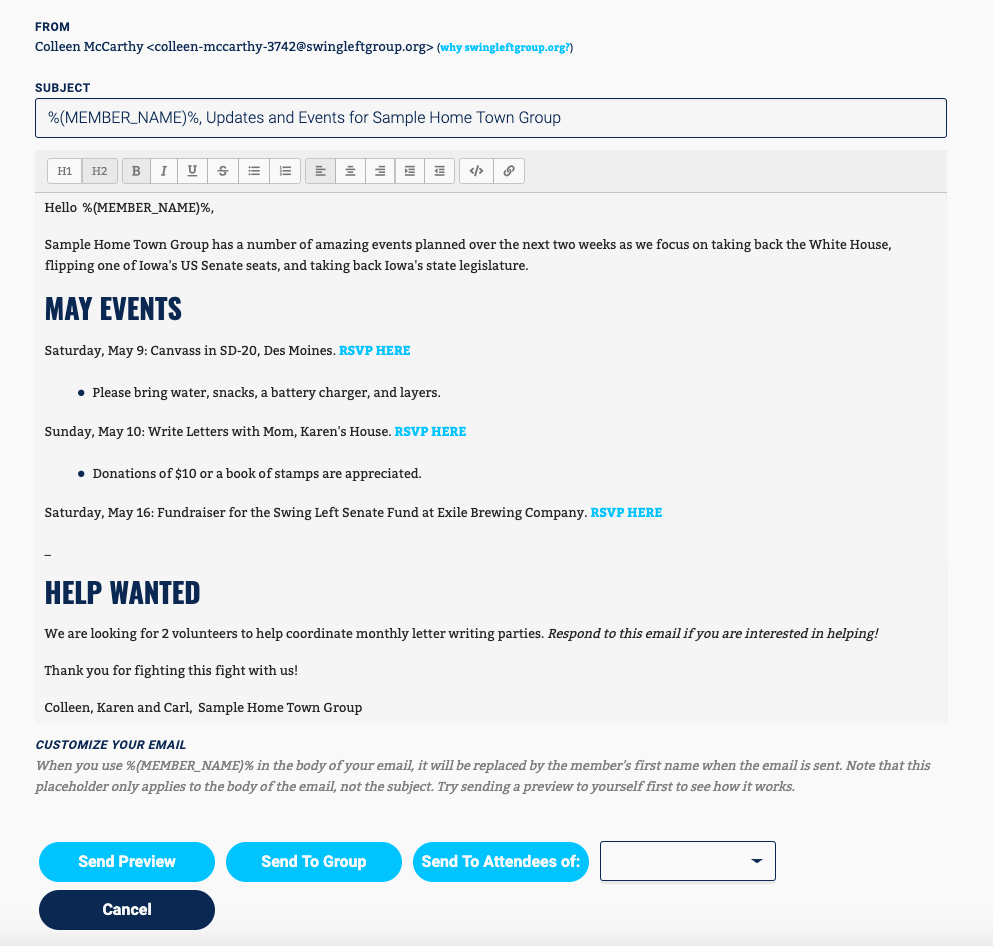 Welcome emails are automatically sent to anyone who joins your group on the Swing Left website at: swingleft.org/groups. You can customize your welcome email at any time using the same type of formatting functionality described above for emailing your volunteers.