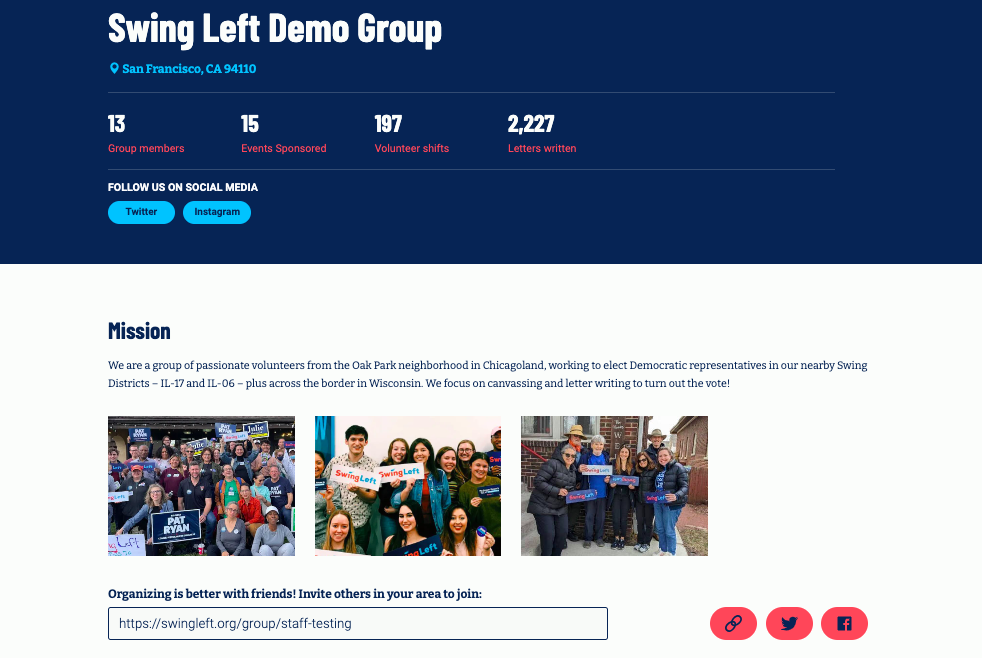 In every election cycle, it’s crucial for volunteers to be able to get engaged with local Swing Left groups to make an impact in competitive elections across the country. Swing Left’s Group Builder provides local groups the ability to be discovered by volunteers, plus communication and volunteer management tools to help you recruit new volunteers and engage your existing members. Follow this guide to get the most out of Swing Left's Group Builder to manage and grow your group!