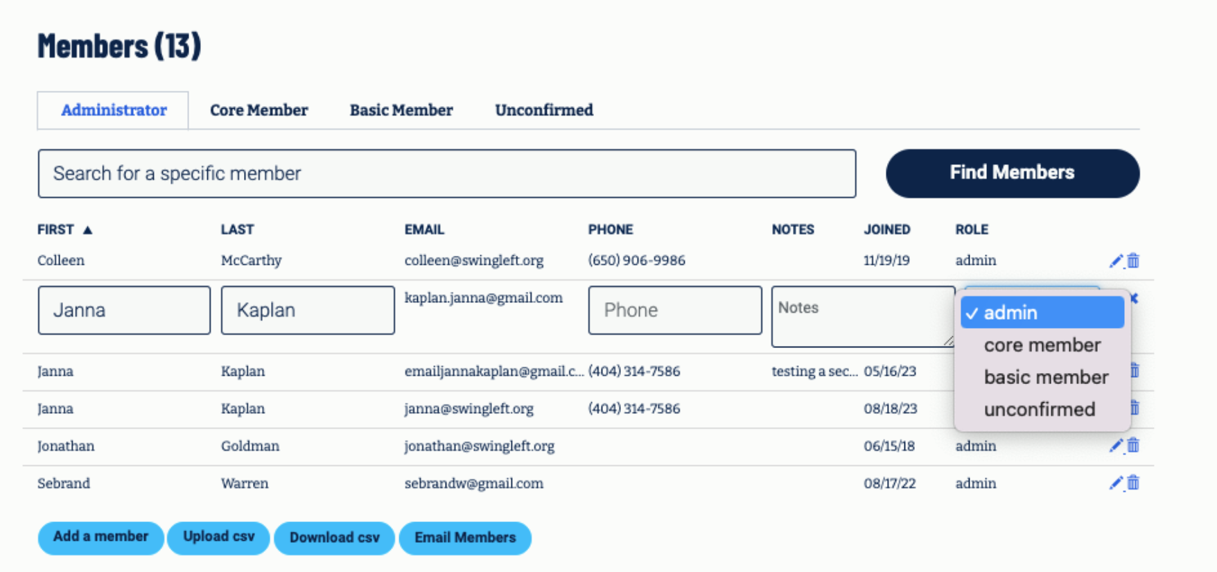 Your Members list includes everyone who has found your group on swingleft.org and joined, as well as anyone that has been uploaded to the list. To change a member’s role or delete a member: