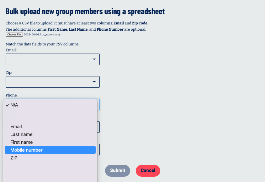 Important: Do NOT upload contact information for people who have not been involved with your group or associated events (ex. lists of people you find on the internet, other groups member lists who have not consented to be part of Swing Left, etc.). Uploading lists of people from the Internet, who have not given you explicit permission to receive email from you, can have a severe impact on the deliverability of all the email that Swing Left sends and will increase the likelihood that emails that you send from Group Builder will go to spam.